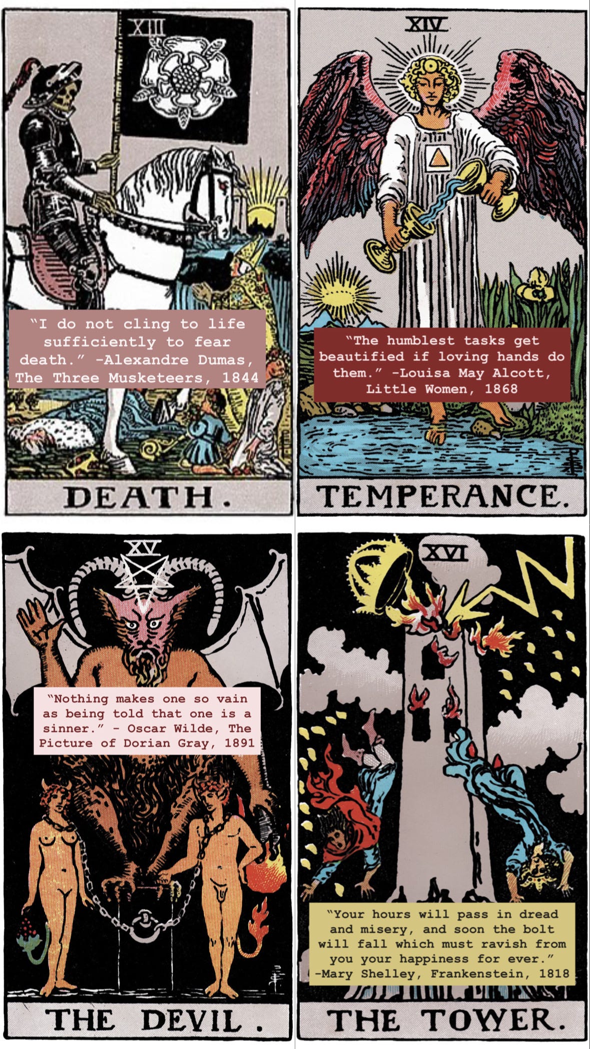 Driving home from work I was reminded that I needed to post these. My immediate thought was, “ooof, it doesn’t feel great to be posting these right now. With the state of the world being what it is, posting 4 tarot cards and the words I heard or read in classical literature that I associated with them, seems pretty GD trite.” But shortly after that assessment, I was reminded which 4 cards would be posted, and nothing seemed more right. I put all of this together before the New Year hit. It’s fascinating how meaningfully this particular quartet materialized in the timeline. Without further ado…