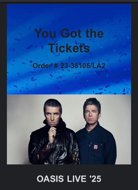 As this all unfolded some good friends caught wind of my mild bout with psychosis known as pulling-an-all-nighter-for-some-tickets-to-a-show-in-a-country-that’s-6,000-miles-away. They were quite sympathetic and swore to help me get a presale code if they announced US dates. Sure enough, Oasis announced US tour dates including two nights at The Rose Bowl, about a half hour drive from my house!!! The friends came through! Presale code acquired, multiple friends buying tickets at the same time, and voila! I ended up getting tickets for both nights. I swore on that day, I was getting a dog-sitter for the weekend and declared September 6th and 7th, 2025 to be Oasis Weekend. Nothing would bring me down (& trust me, some tried).