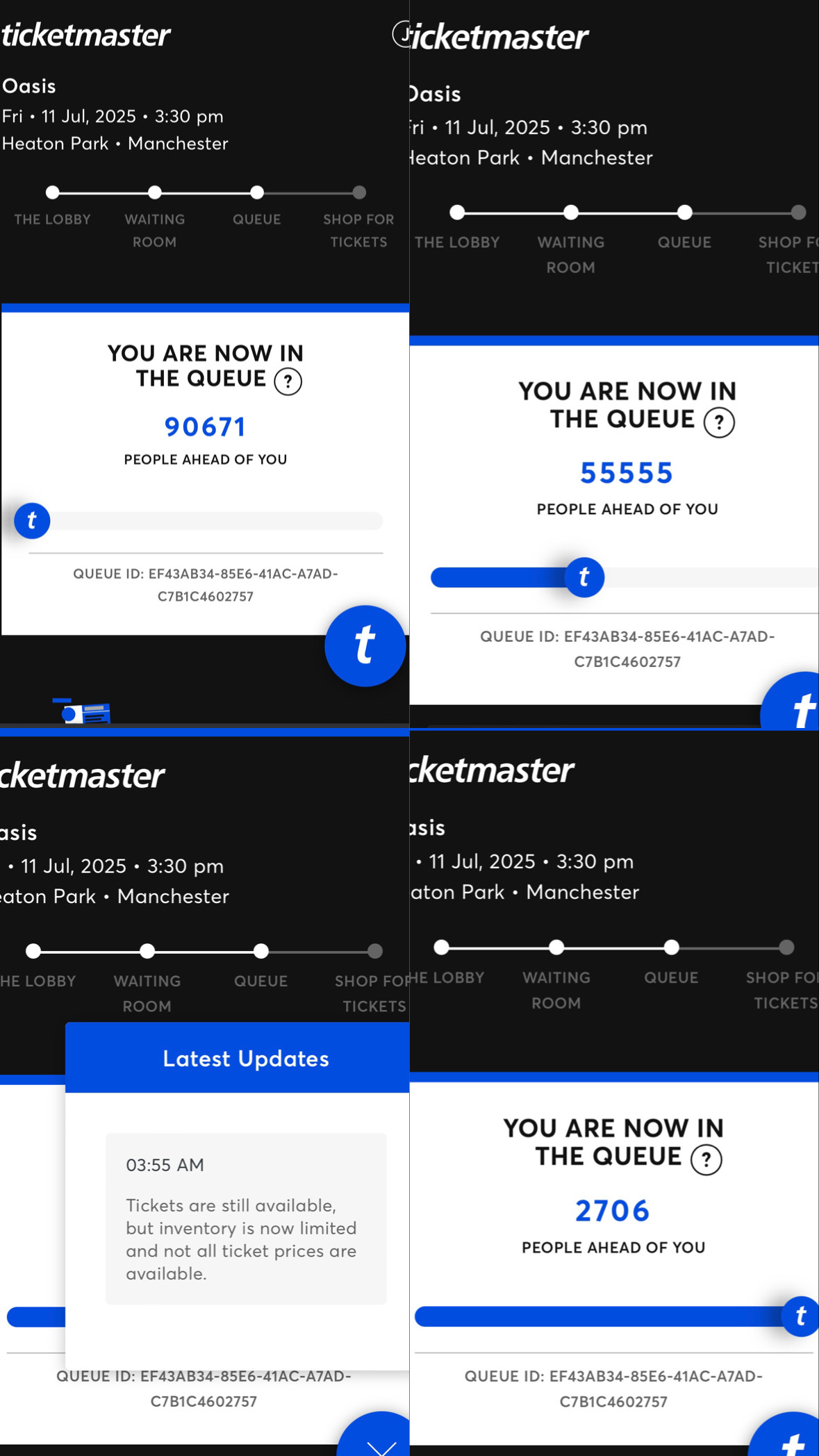 In the summer of 2024, I heard they were reuniting for some UK shows and I knew this was my chance! I was born in the UK and I still travel back roughly once a year, give or take. This was a perfect excuse for another adventure in some of my favorite cities. I prepared myself to pull an all-nighter for the on-sale. Tickets went on sale on a Saturday at 9 am UK time, making it 1 am on the west coast of the US, where I sit. I was working that night and had to start the process while I was still wrapping up the evening’s duties. Around midnight, I opened my browser and had it at the ready for when the queue opened in hopes to get a decent spot in line. When the official queue opened at 1 am however, I was something like 90,000th in line, (I come bearing receipts). Unreasonable at best, impossible at worst, but it didn’t matter, I persisted. You could only choose one of the dates to try to get tickets for and I chose one of the Manchester.dates. I figured the boys’ hometown would be most special. I easily made cases for all the other locations as well, but something was calling me to try for Manchester.