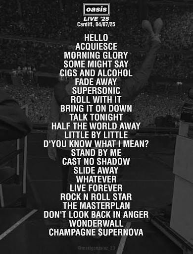 Fast forward to July 4th, 2025. This was a rough day in the States. I won’t speak as if we’re a monolith, but I wasn’t feeling particularly patriotic once the ICE raids started happening in LA. I didn’t celebrate America’s Independence Day this year, instead I celebrated Oasis Day and treated it like it was Christmas in July. Because for me, it was! July 4th was the glorious kick off of their reunion tour in Cardiff. I didn’t bother with hot dogs and fireworks, instead I ate Mexican food and watched as much Oasis bootleg and social media footage as I could find. I started a whole new highlight reel on my Instagram page dedicated to the “Oasis Countdown”. This silly act of what, “Some Might Say,” is cringe, but I call unapologetic enthusiasm, brought me free and genuine joy all summer. This is the way. By the time Oasis concluded their initial run of UK and Ireland reunion dates I had watched their whole set from every location, and monitored the set lists closely for any deviations, of which, there were none!