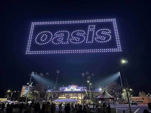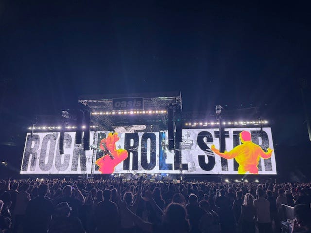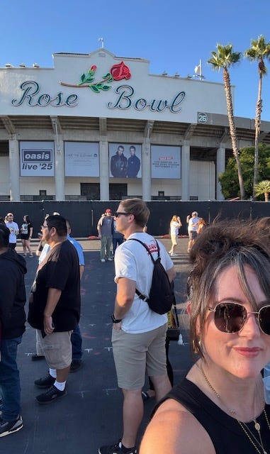 As Oasis Weekend 2025 neared, more and more people were letting me know they were going to the shows and they started offering incredibly generous things like helping me with clandestine merchandise intel, highly-sought-after parking passes, and the absolute shocker of them all, coveted floor passes! On night one, I watched from the stands and had my mind utterly blown by how great they sounded, how good they looked, the art, the setlist (which of course by this point, I already knew), and the beauty of the experience as a whole. The people in the crowds were so, (what’s this?), joyful. It was a stark contrast to what I experience on a more day-to-day basis in the parlance of our times. Even though the lines were offensively long, the heat was sticky and oppressive, and sometimes we were crammed body to body in tunnels as well as along the concourse, there was no palpable undercurrent of fear or stress like what I see everyday now. Los Angeles has suffered an inordinately brutal 2025. This salve was needed and the result was replenishing!