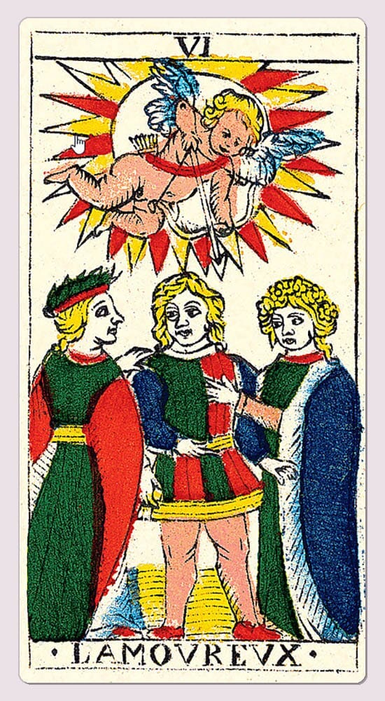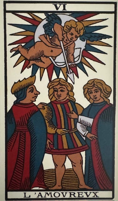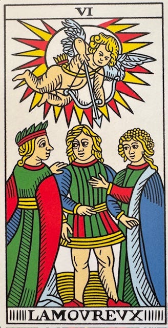 Last week I posted musings + prompts based off of the first image shown below. You can revisit that post here if you like. It’s a card I pulled from a reprint of a deck called 1930 Tarot de Marseille which was originally produced by Grimaud. The card is titled (in English) The Lover. Note: not “The Lovers”.